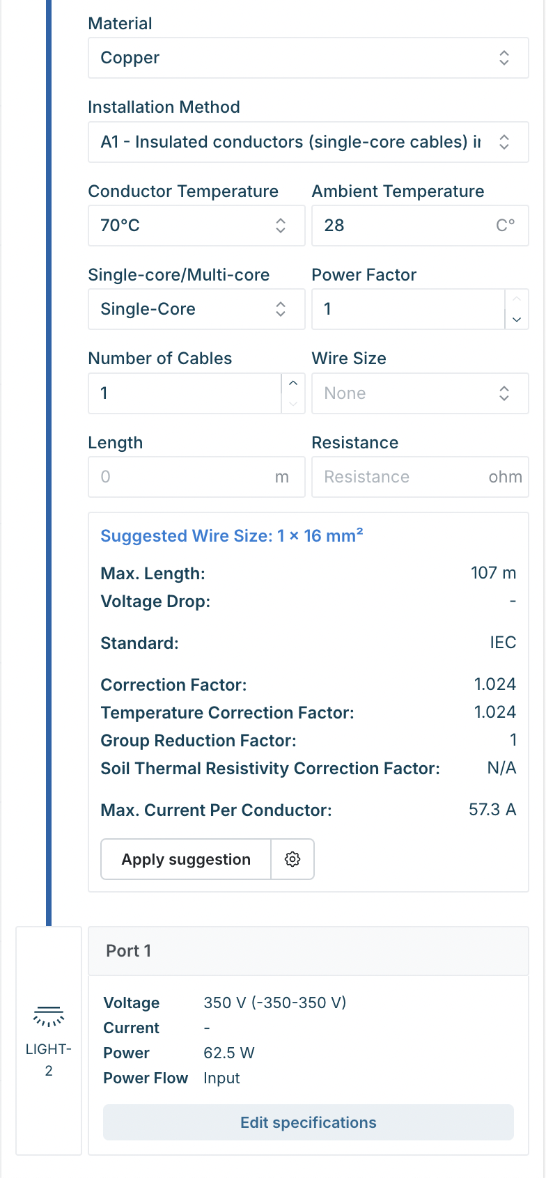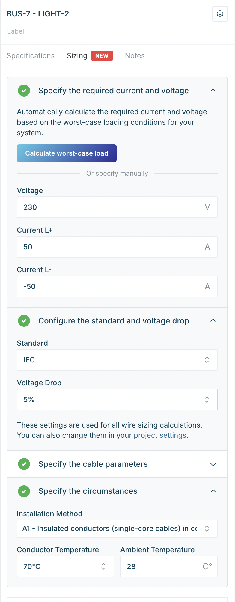 Let our wire sizing engine suggest or validate your wire sizes according to IEC and NEC standards.